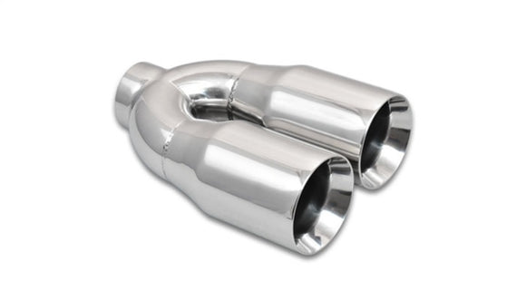 Vibrant Performance Dual Outlet, weld-on Exhaust Tips are manufactured from 304 Stainless Steel for optimum corrosion resistance. They are available with either dual round or dual oval outlets and a variety of different outlet edge profiles. All Vibrant Performance dual outlet tips are 10” long and are offered with inlet diameters ranging from 2.25” to 2.5”.
